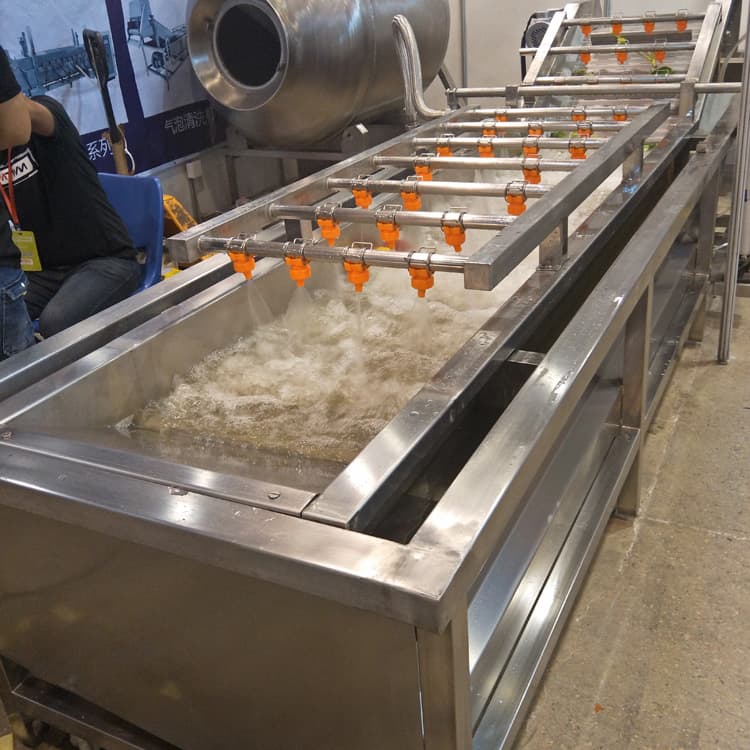 氣泡清洗機(jī)是將蔬菜水果,采用高壓氣泡水浴沖擊下,使物料在水里翻轉(zhuǎn),有效地分離蔬菜表面的泥沙、雜質(zhì)、污物,水流的大小可以控制,清洗下來的污物,經(jīng)濾網(wǎng)被攔截,而清潔干凈的果蔬,由蔬送帶提升進(jìn)入下一個(gè)工序,而在提升過程中再次被噴淋清洗。工作過程中,進(jìn)水管和噴淋水管始終供水,使水箱內(nèi)的污水逐步被替換。