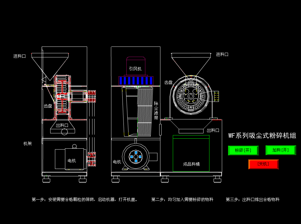 機(jī)器高速運(yùn)轉(zhuǎn)下活動(dòng)刀盤與固定齒圈發(fā)生撞擊摩擦,物料通過(guò)與刀具之間的切割撞擊摩擦獲得粉碎。粒度大小可通過(guò)更換篩網(wǎng)獲得。產(chǎn)量要求不高可選用此配置,此配置含旋風(fēng)出料和布袋除塵。粉碎好的物料經(jīng)旋風(fēng)分離從出料口流出。粉塵在吸塵電機(jī)作用下進(jìn)入布袋除塵,過(guò)濾回收再利用。刀具可根據(jù)不同物料更換不同刀具。